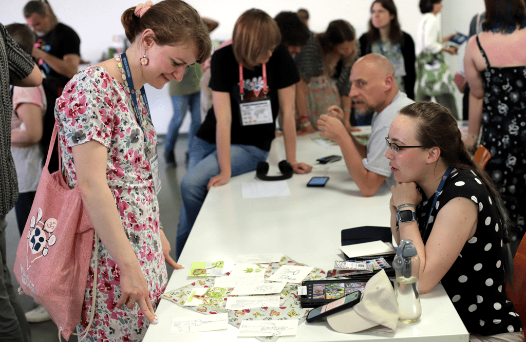 Porozmawiałam z organizatorem, załatwiłam sobie stoliczek i zadowolona położyłam szkicownik. Po czym rozglądam się, a tu różne obrusy, kolorowe wystawki, naklejki, wersje testowe aplikacji do nauki języków i inne cuda. Patrzę znowu na swój stolik, bida, nic dodać, nic ująć. Ale przecież już pokonałam tego wewnętrznego krytyka i się wystawiłam, nie mogłam pozwolić mu na zwycięstwo. Najpierw zamiast kłaść sam szkicownik, postanowiłam rozłożyć poszczególne prace osobno; dobry pomysł +10 do atrakcyjności. Ale było jakoś pusto. Po intensywnym myśleniu przypomniałam sobie, że w plecaku mam błękitną chustkę, czy może bardziej taką apaszkę w Pokemony, którą zawsze zawiązuję na karku, żeby mnie nie przewiało. Rozłożyłam ją jako obrusik, na nią położyłam te moje “dzieła” i już to zaczynało jakoś wyglądać! Do tego włączyłam swój profil na Instagramie na tablecie, żeby można było zobaczyć inne prace w moim wykonaniu i voilà! Artystyczno-prowizoryczny stoliczek gotowy!